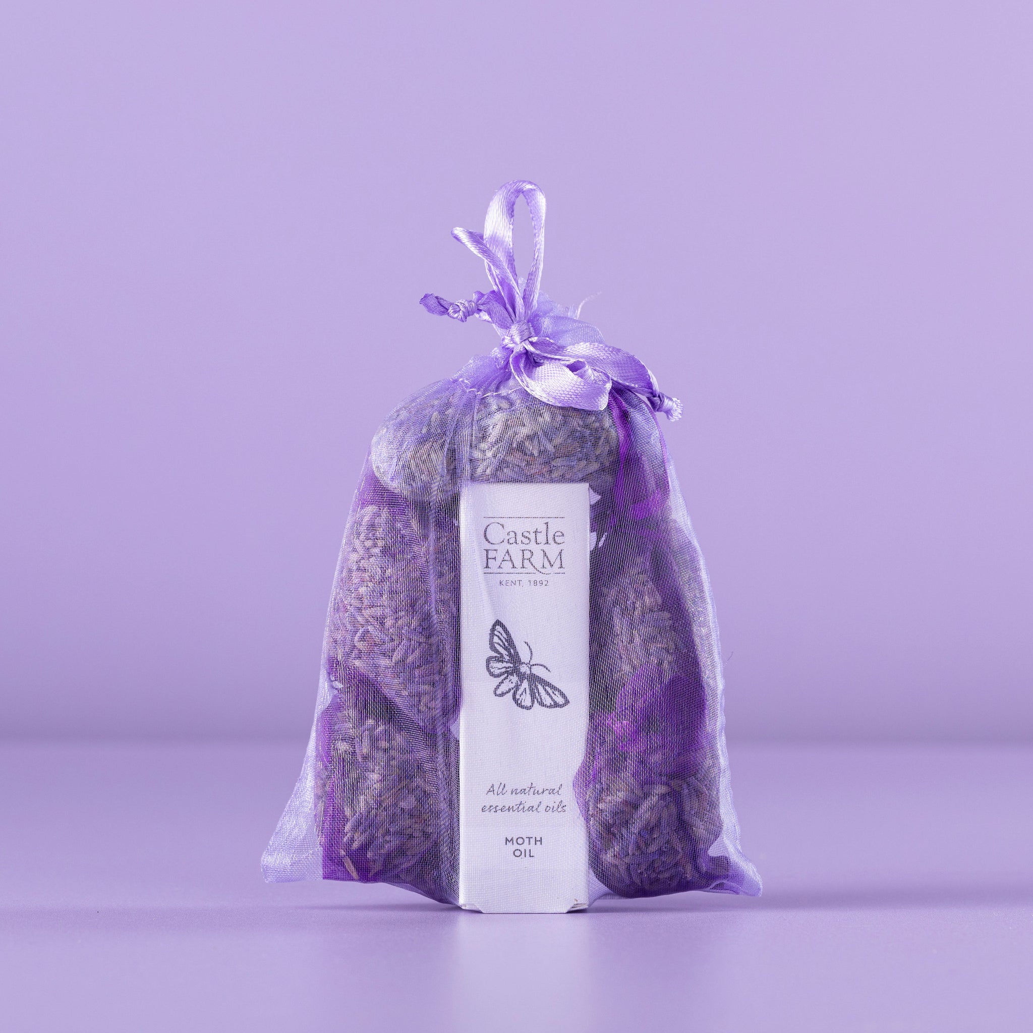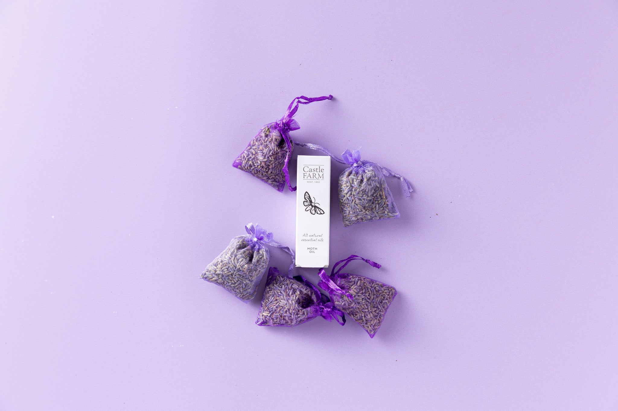1 x 10ml Lavender Moth Oil and 5 x lilac/purple small Lavandin organza bags or 1 x 30ml Lavender Moth Oil and 7 x lilac/purple small Lavandin organza bags.