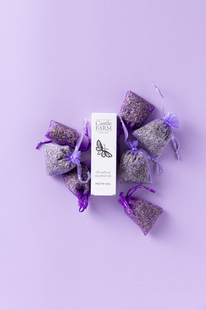 1 x 10ml Lavender Moth Oil and 5 x lilac/purple small Lavandin organza bags or 1 x 30ml Lavender Moth Oil and 7 x lilac/purple small Lavandin organza bags.