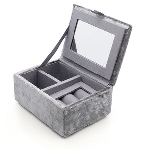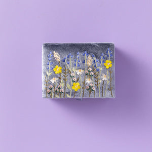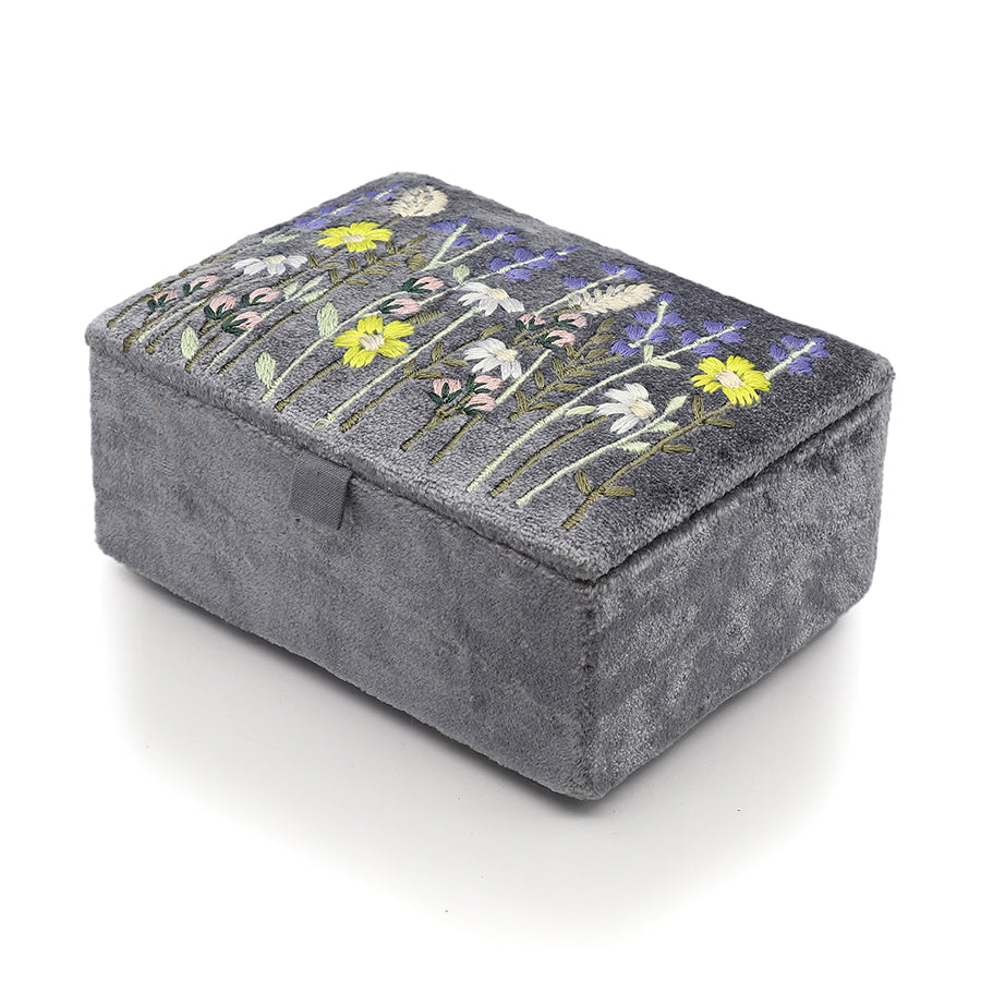 This jewellery box is crafted from smoky grey cotton velvet and finished with an elegant embroidered lavender meadow.